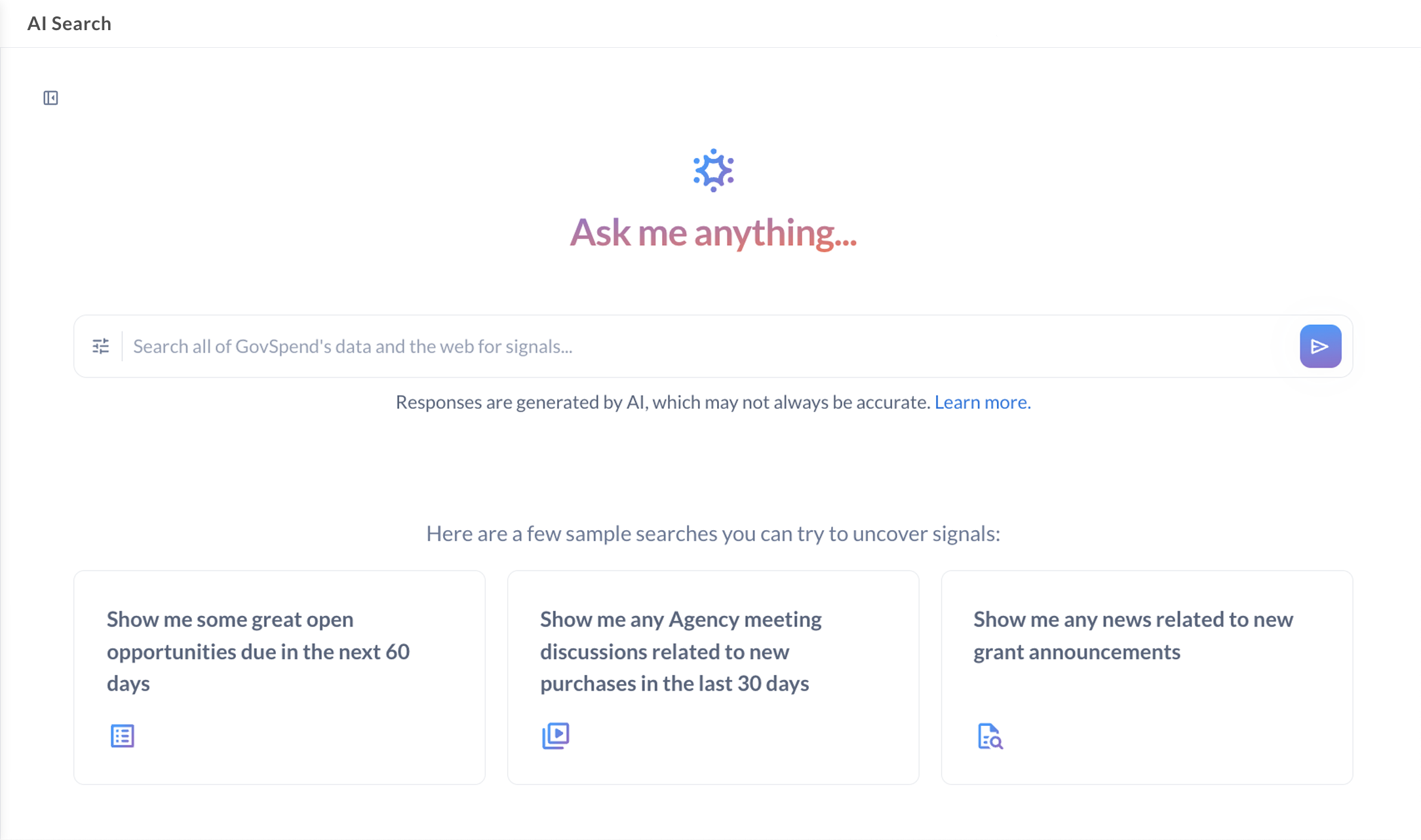 GovSpend bietet eine Fülle von ständig aktualisierten Informationen zu Regierungsverträgen. Das Kundensupport-Team hat alle meine Suchkriterien mit mir eingerichtet. Ich kann nun wöchentliche Updates einsehen. Dies hat zu qualifizierten Zielen, Erfolgen bei blind ausgeschriebenen Anfragen und strategischen Akquisitionen geführt.