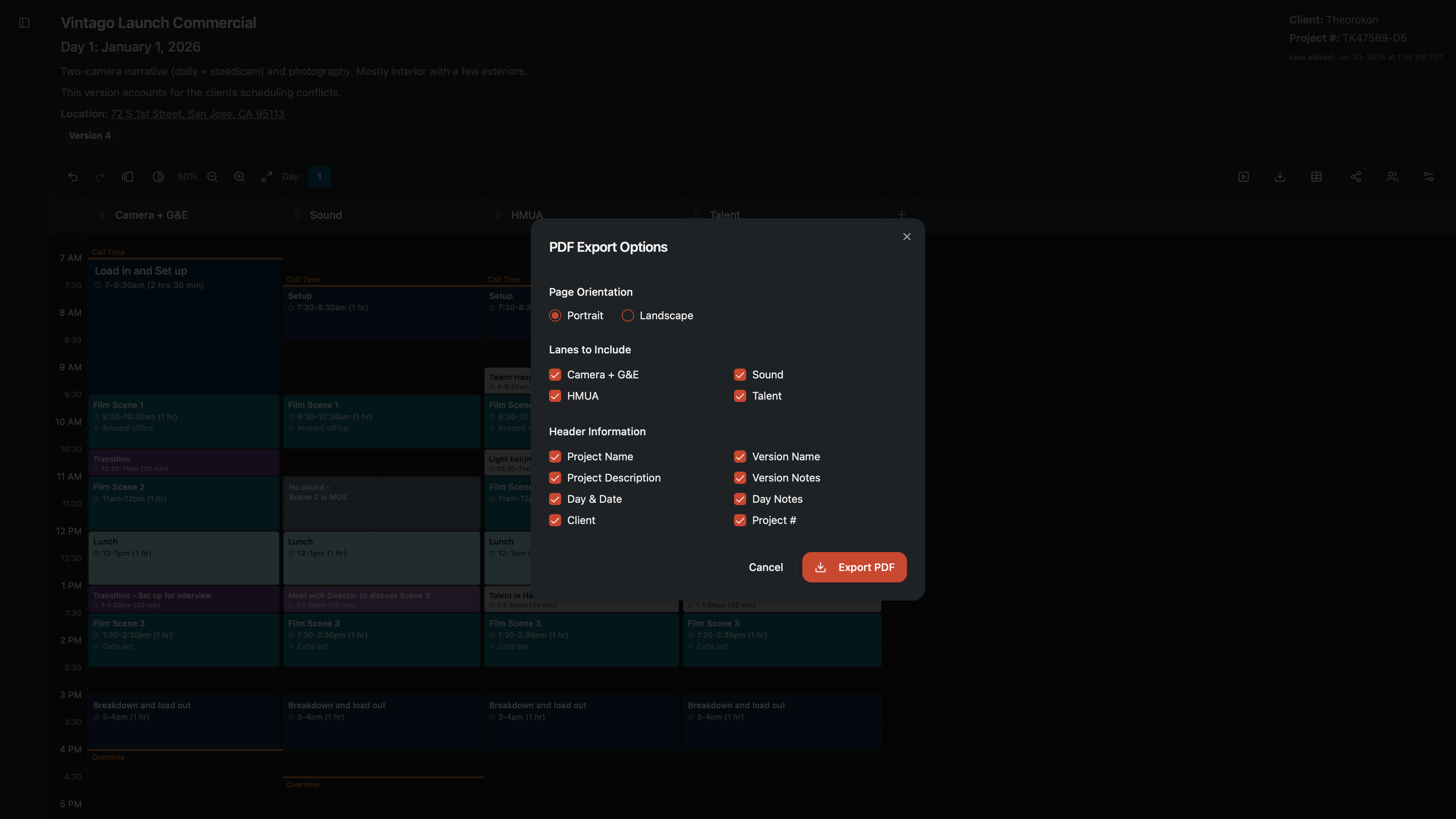 - Scheduling: Manage performances, rehearsals, special events, pre-production activities, staff and cast schedules, milestones, deliverables, venue management, crew booking, trucking, and inventory usage.