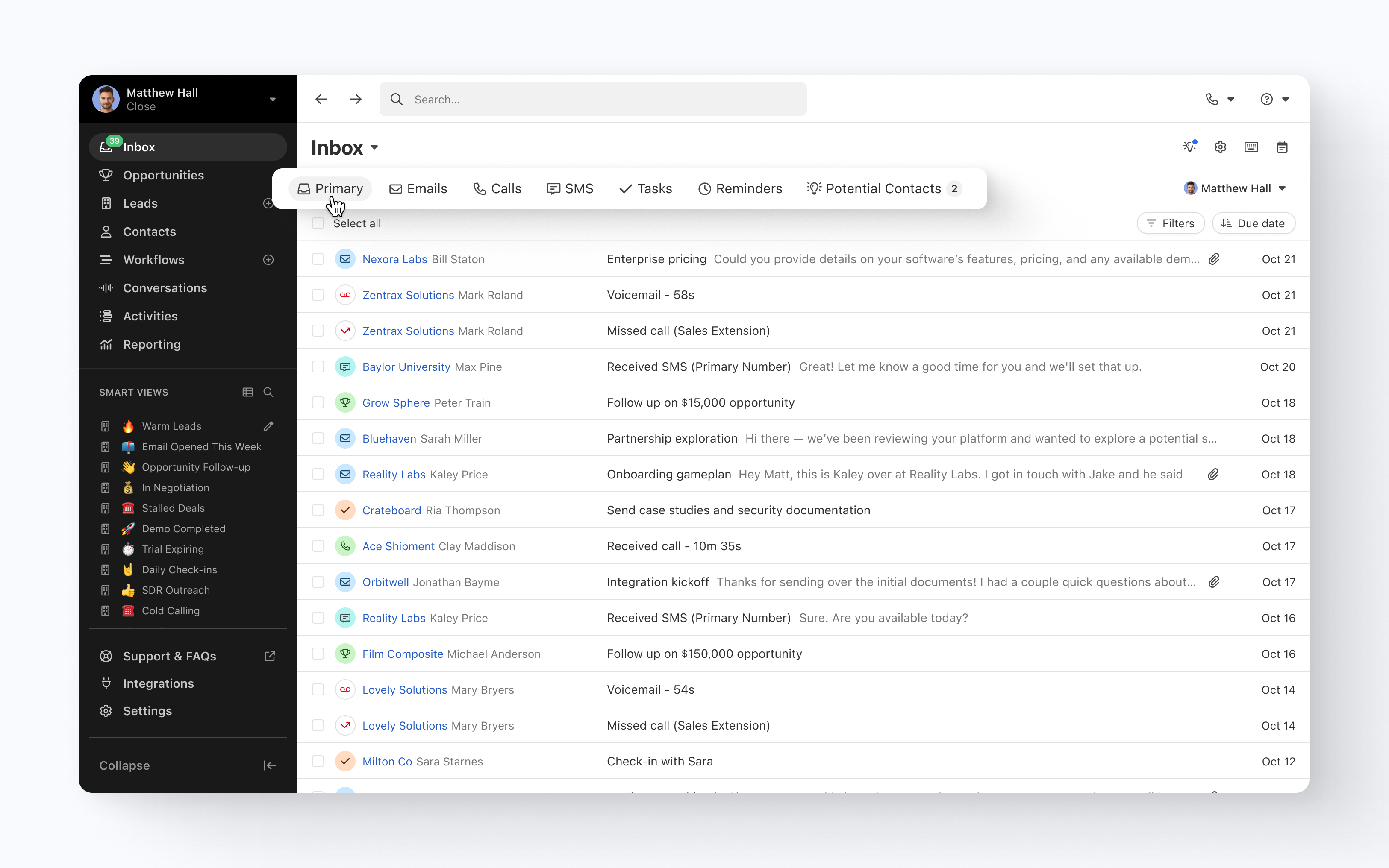 Close integra chiamate, email e SMS nativamente all'interno della piattaforma. Ogni conversazione è automaticamente registrata, ricercabile e collegata al record di contatto a cui appartiene, in modo che i team di vendita possano aumentare la loro disciplina di follow-up senza dover gestire strumenti o lasciar sfuggire potenziali clienti.