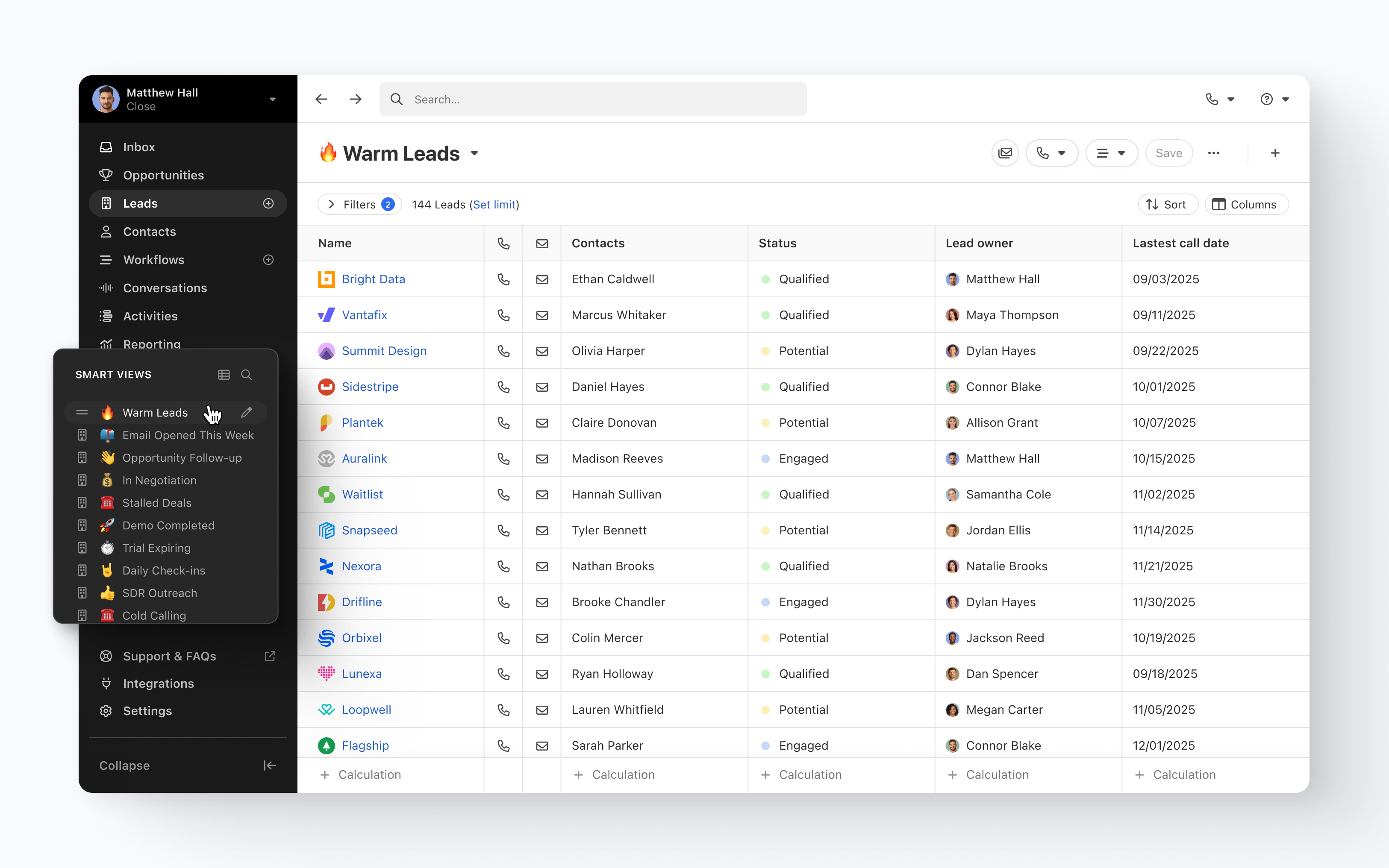 - Smart Views per elenchi di contatti filtrati dinamicamente in base ad attività, stato o criteri personalizzati