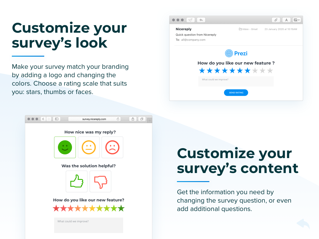 - Ottieni feedback in tempo reale sull'esperienza utente del tuo sito web. I sondaggi pop-up di Nicereply possono aiutarti a convertire più clienti migliorando l'usabilità del tuo sito web e software.