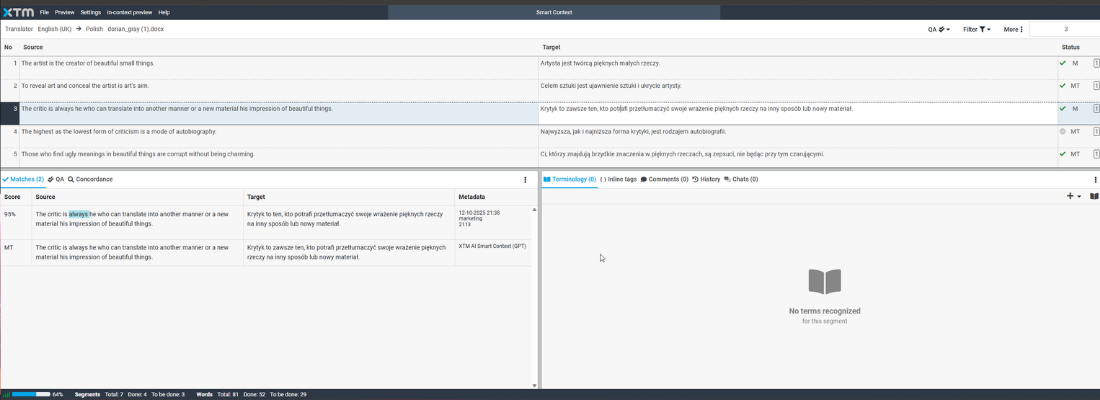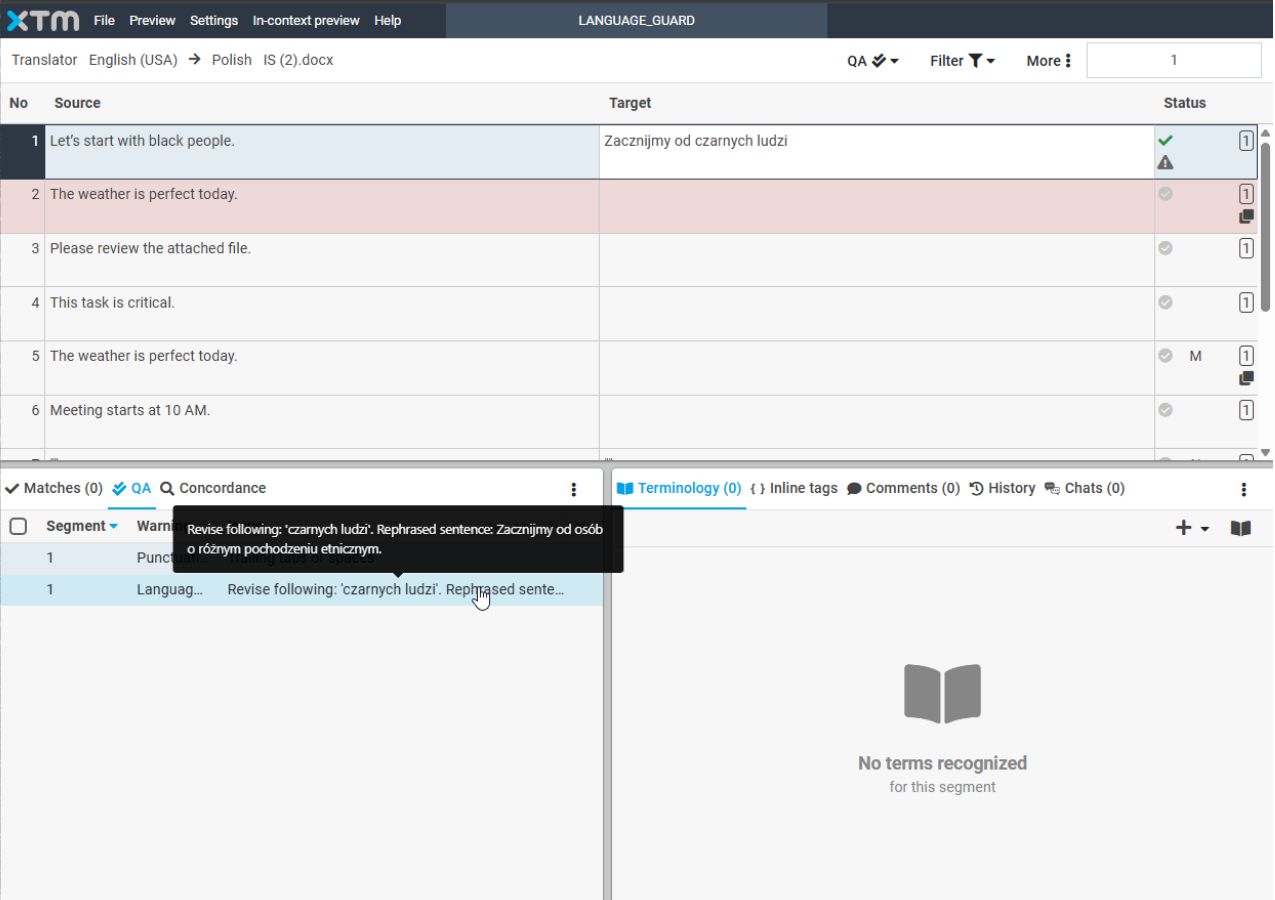 Le caratteristiche principali di XTM includono strumenti alimentati dall'IA come Intelligent Score per la valutazione automatica della qualità delle traduzioni, Language Guard per il rilevamento di linguaggio dannoso e SmartContext per la traduzione AI coerente con il marchio. Inoltre, la piattaforma offre una memoria di traduzione avanzata con abbinamento intelligente, richiamo di sottosegmenti e prioritizzazione della TM per massimizzare il riutilizzo dei contenuti e minimizzare i costi. Le funzionalità di contesto visivo consentono ai linguisti di tradurre nel contesto con anteprime live, riducendo significativamente i cicli di revisione e la necessità di post-editing.