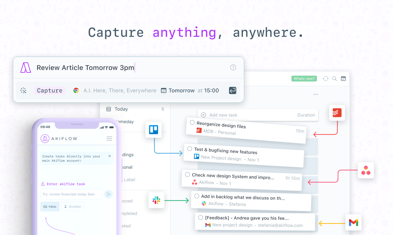 We built Akiflow focusing on speeding up the fundamentals of productivity: capturing tasks, processing them, and always knowing what to work on.