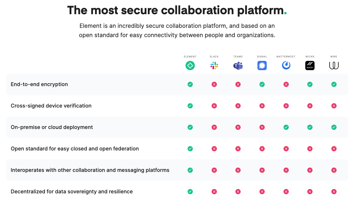 Element's best aspect is that their platform has been built with a decentralised model, built on a matrix protocol, which gives us complete control over data and communication. They also have end-to-end encryption, the flexibility to self-host, and the capability to connect across different servers, which is unique among other tools. This platform is also giving more customisations and extensively integrated third-party apps. Review collected by and hosted on G2.com.