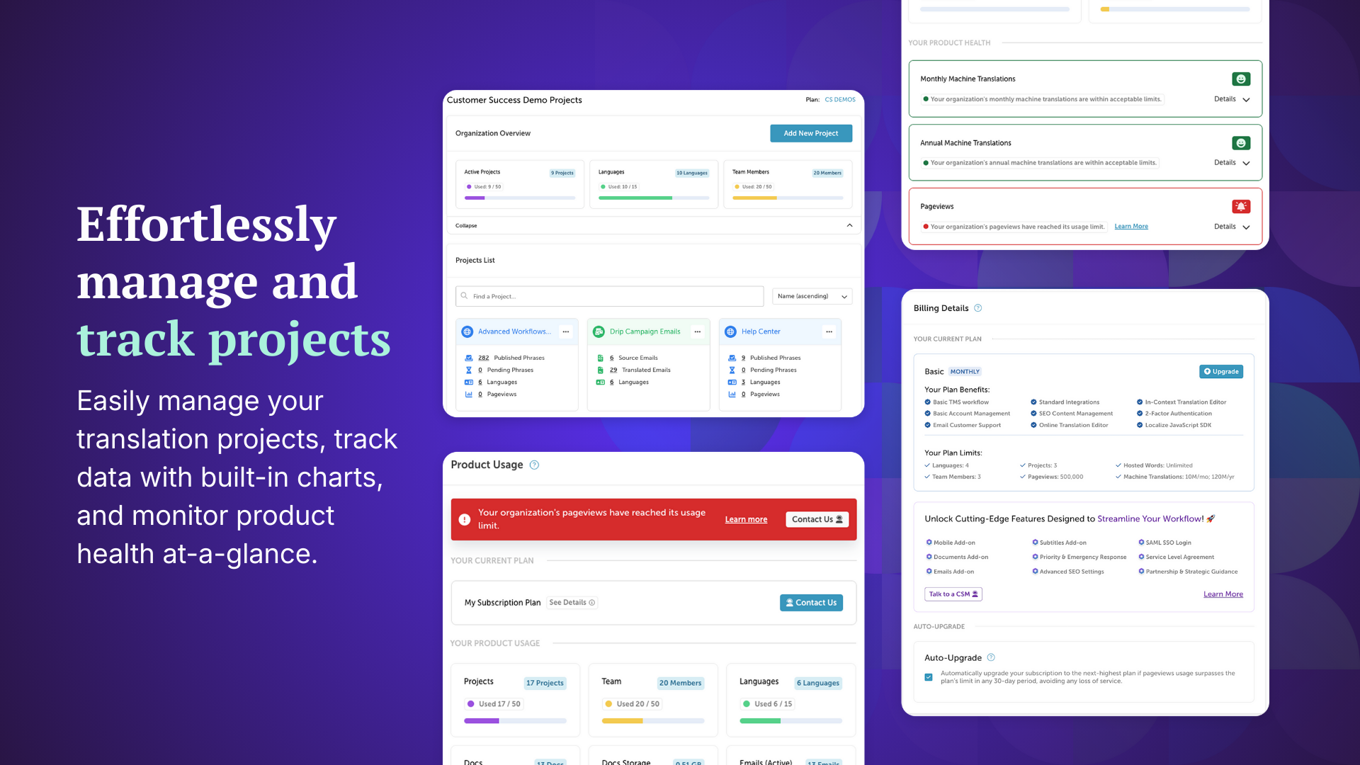 ✓ Translation Management: Centralized dashboard to manage languages, translation statuses, user roles, and customizable workflows across projects.