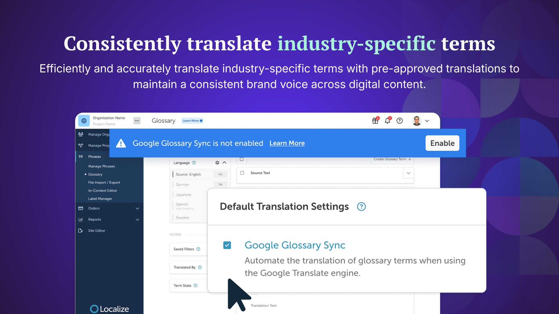 Localize is a translation management software platform that helps SaaS, financial services, healthcare, and e-commerce companies manage software localization, AI translation workflows, and website translation from a single centralized dashboard.