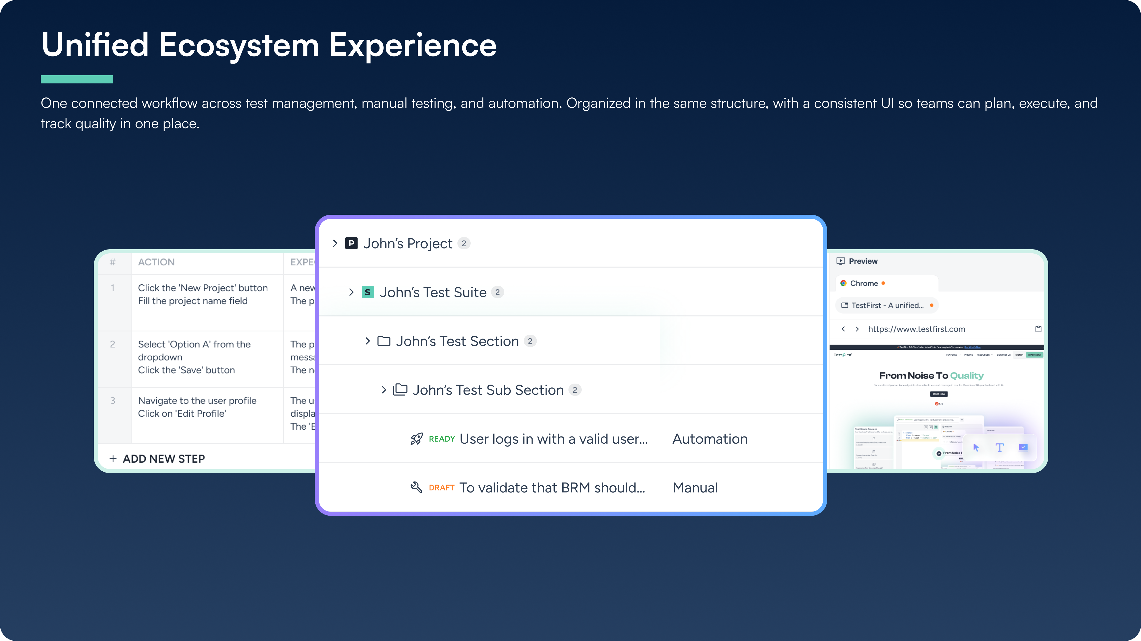 TestFirst also brings manual testing, automation, and test management into the same system. Teams can organize test cases, plan execution, track results, collaborate across roles, and keep coverage up to date from a single workspace. This reduces tool sprawl, improves visibility, and creates a much tighter QA workflow from start to finish.