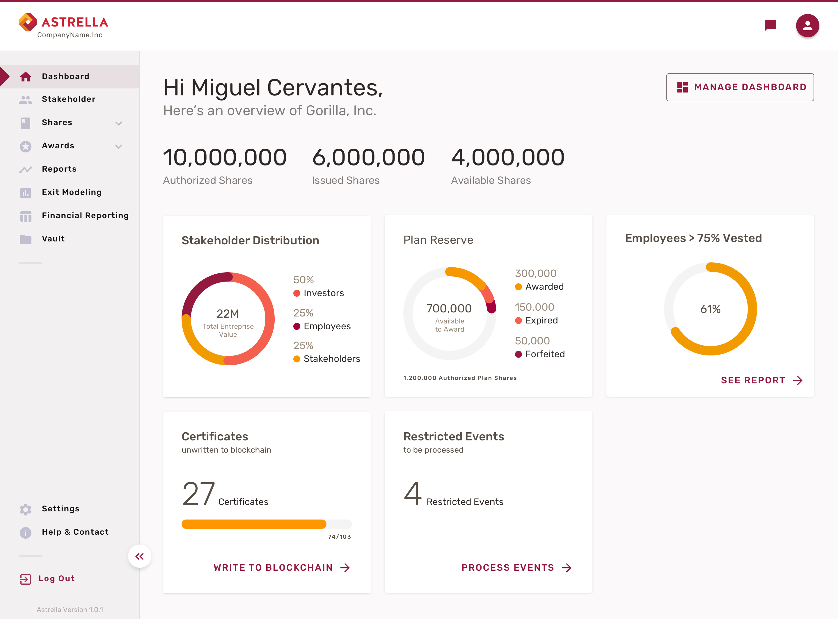Gestão de Patrimônio: Astrella simplifica a gestão de patrimônio e propriedade de ações para uma empresa. Facilita a emissão de opções de ações e concessões de patrimônio e mantém um registro claro de quem possui o quê.