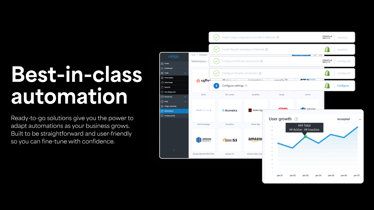 Para acelerar a implantação, Celigo oferece Aplicativos de Integração totalmente gerenciados e modelos de integração reutilizáveis que simplificam casos de uso comuns, como automação de pedido para pagamento, integrações de ecommerce e fluxos de dados financeiros. Monitoramento centralizado, controles de governança em tempo de execução e arquitetura escalável dão às empresas visibilidade total nos processos de integração e automação, mantendo confiabilidade e conformidade.